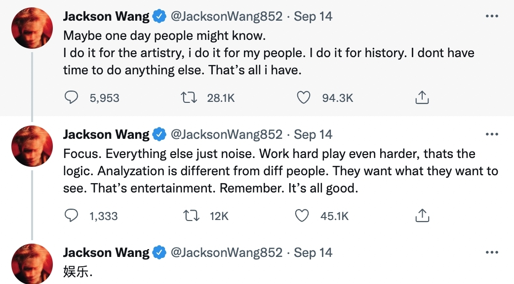 不過,謠言不斷愈演愈烈,他更被內地傳媒暗指為「真正時間管理大師」,令王嘉爾在Twitter上連發3段文字反擊。他先是以英文寫下:「或許有一天人們會知道,我的所為都是為了藝術、為了粉絲、為了歷史」