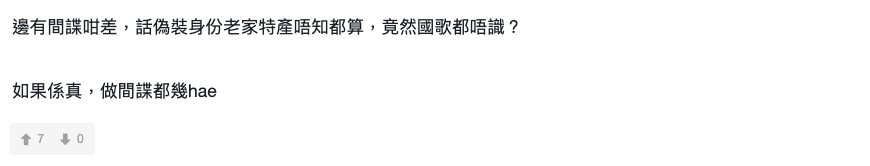 事件在網上迅速發酵,不少香港網友也忍不住留言,指這樣的舉報行為令人感覺很恐怖:「吓,我連普通話都唔識講,點算」也有人說,自己除了國歌以外,女網友考男友唱的歌,別說是1、2句,就連聽都沒聽過:「而家唔識唱歌都係罪?!」