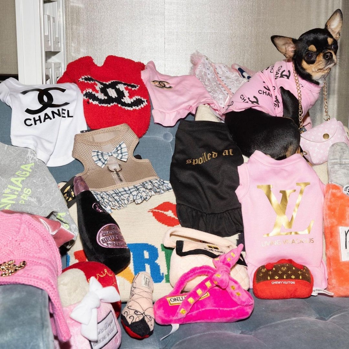 Paris Hilton家中的狗狗出手闊綽,不但為牠們興建一幢2層高迷你豪宅,又大量奢侈名牌衫及配件,就連自己的名牌袋都大方被狗狗佔據。
