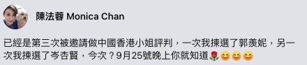 陳法蓉近日在FB宣布喜訊,她受邀請將會出任今屆的《香港小姐競選》評審。可是在發文中,她卻說:「已經是第三次被邀請做中國香港小姐最上鏡小姐評判」網民們疑惑地問:「不是《香港小姐競選》嗎?」陳法蓉的「求生欲」被嘲笑很多餘~