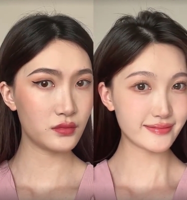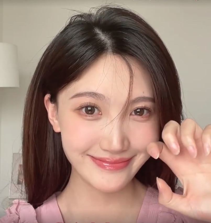 唇妝不要畫那種邊緣清晰的畫法,會顯得很老氣。選擇一個顏色較淺的唇釉打底,塗在嘴唇中間用手暈開,上嘴唇可以暈染出去一點,看起來可以縮短人中,最後再疊加一個透明唇釉就完成了!