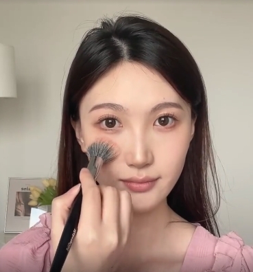 再選擇一個跟妝容比較搭一點的腮紅畫在臉中,最低點不要超過鼻頭,而鼻頭和下巴都可以來一點,會顯得更減齡!
