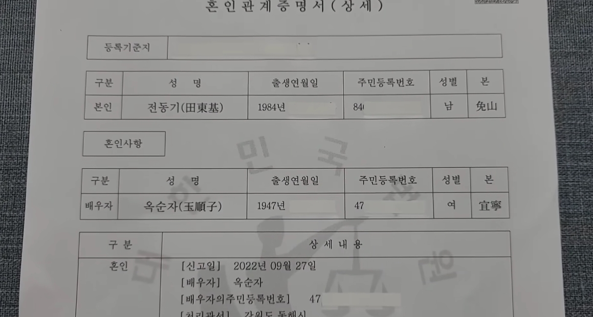一開始這對「婆孫戀」就表示已經結婚,年齡差距如此之大,自然會引起網友們的質疑。他們也大方地放上各自的戶籍騰本,可是有南韓網友表示如果已經是夫妻,一張騰本就能夠證明關係,而且上面兩人的居住地址並不一樣,反而不像是夫妻。後來玉順子解釋,因為兩人的經濟狀態不好,因此當時還沒有完成結婚登記。