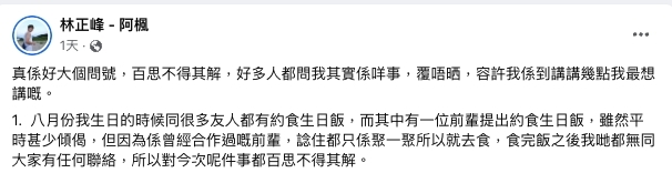 林正峰得知新聞後,瞬間發出四點聲明。他解釋說那是生日飯,更稱劉溫馨為「一位前輩」:「其中有一位前輩提出約食生日飯,雖然平時甚少傾偈,但因為係曾經合作過嘅前輩,諗住都只係聚一聚所以就去食,食完飯之後我哋都無同大家有任何聯絡」暗示跟劉溫馨根本不熟,而且是劉溫馨邀請吃生日飯的,事後也沒有再聯繫。