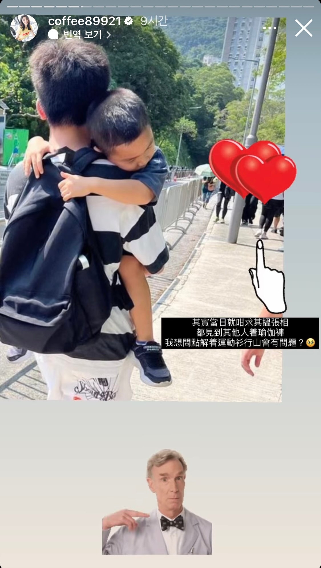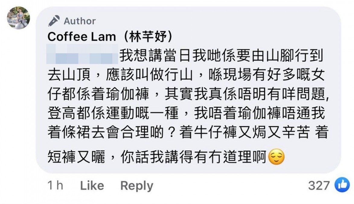 Coffee其後再解釋:「其實當日我哋登高由山腳柴灣行到山頂凌霄閣,其實都係做緊運動,全程行到身水身汗面容扭曲,咁我想問着運動衫係有乜嘢問題?總好過我着到登台咁去拜山啦係咪?同埋我之後都係去郊外風箏場野餐同放風箏,全日都係運動日,大家認為着運動衫褲係咪好合理呢?」她又上傳重陽當日有不少人都穿瑜伽褲上山,認為大家只是穿一套平常的運動服。
