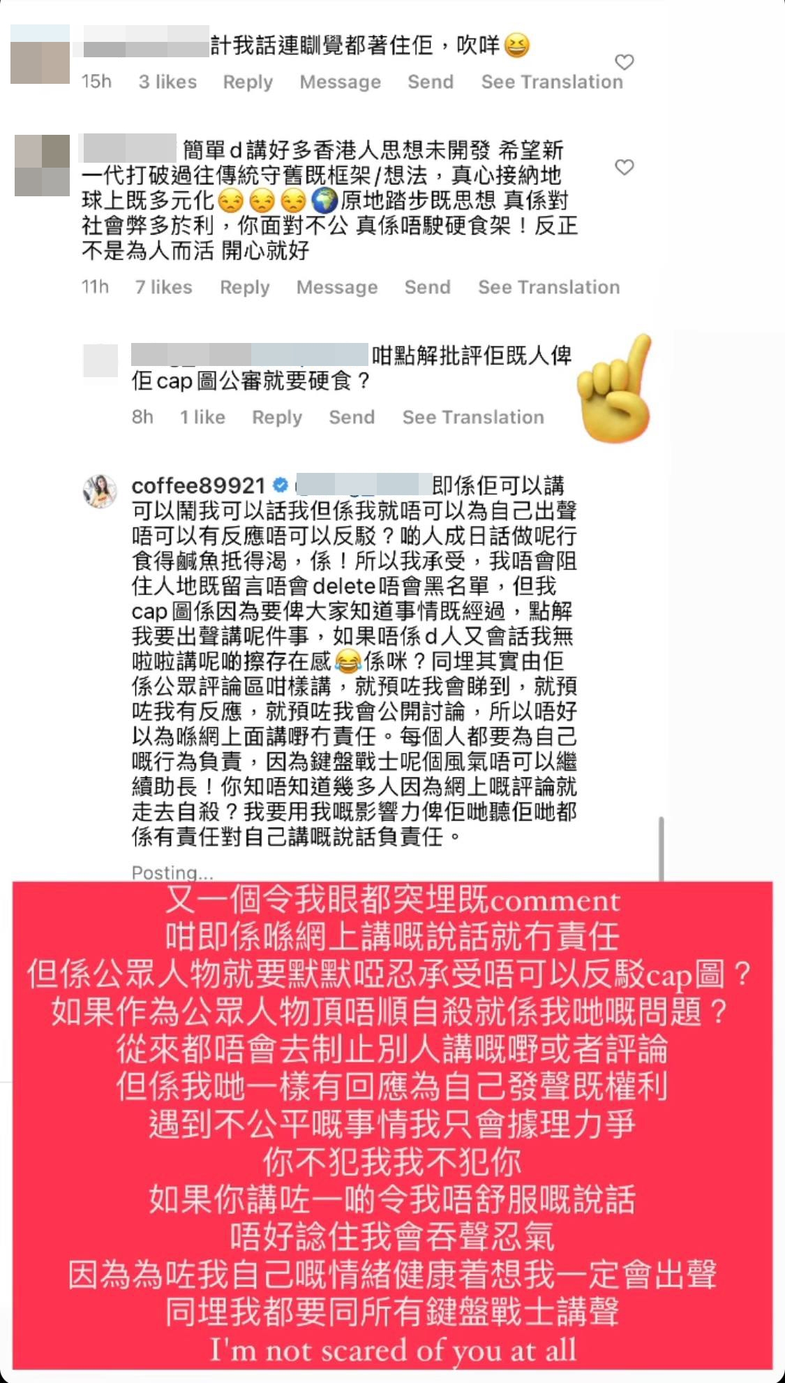 但由於Coffee公開網民的帳號來公審對方,竟然有網民留言「點解批評佢嘅人要俾佢Cap圖公審就要硬食」結果令Coffee再發文反問是否在網上留言就沒有責任,又指難道作為公眾人物就要默默啞忍不能Cap圖反駁?她指自己從來不會去制止別人的評論,但一樣有為自己發聲的權利。