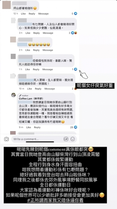Coffee(林芊妤)經常拍片教大家做運動,又開設了自家瑜伽服飾品牌,不時都會在IG與網民互動。日前重陽節Coffee就與家人上山拜祭親人,結果就因為穿著瑜伽褲被網民揶揄,Coffee就憤怒地將網民的留言放上Story,又指要為穿瑜伽褲外出的女生抱不平?