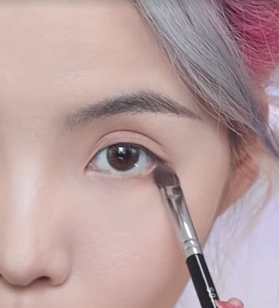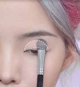 深色眼影從眼頭開始,延伸到瞳孔內側的位置,然後再往外畫一個圓孤形,大概就是一個三角形的形狀。