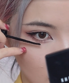 再用眼線液去覆蓋一次,整體眼線的形狀是前細後粗。