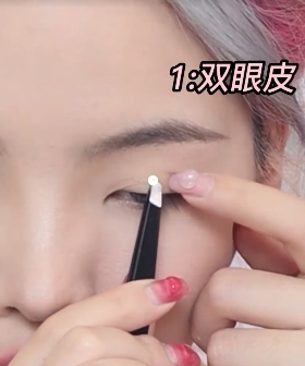 1.先把雙眼皮貼貼在眼睛中間,壓著原本的雙眼皮褶子,貼出一個平行的雙眼皮。
