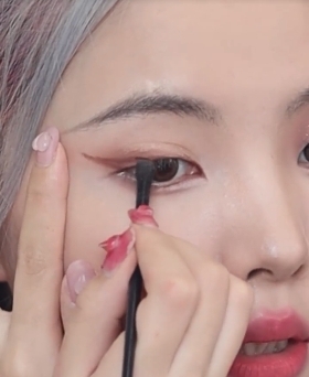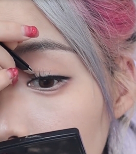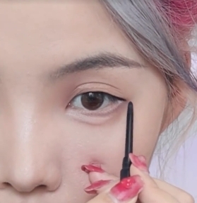 3.再拿出眼線膠筆,先沿著睫毛根部畫一條眼線出來,眼尾順著眼型自然下垂。