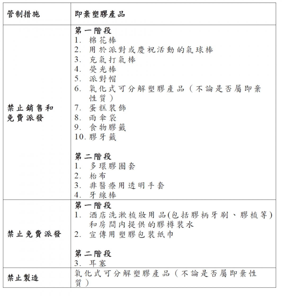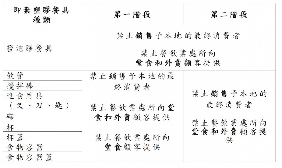 環境局建議提前至最快2023年第4季實施第一階段管制,禁止餐飲業向堂食及外賣顧客提供發泡膠餐具、膠飲筒、膠餐具和膠碟等;至於第二階段暫定於2025年實施,屆時連膠杯、膠盒和塑膠外賣碗都禁止提供,意味買米線不能用膠碗裝、手搖凍飲要「走膠杯」!環境局又補充,留意到市場上大部分的供應商,已為首階段所管制的飲管、攪拌棒、進食用具及碟提供非塑膠替代品,例如紙、軟木等,其價錢與同類塑膠餐具一般相差不多。