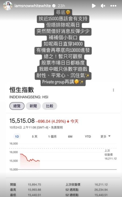 KOL雪姨自從「盆菜事件」後,多次嘗試復出,更試過拍片大講人生金句,化身「雞湯界KOL」。近日有網民發現雪姨不但將之前「盆菜事件」的道歉文刪除,更在Story教炒股投資,想轉型「炒股界KOL」?!恆生指數大跌,雪姨立刻獻出自己的秘訣,教人「尋底」,還指股票市場只是「數字遊戲」,最緊要平常心~但最後竟然加一句有秘密群?