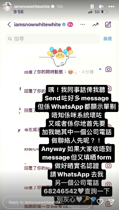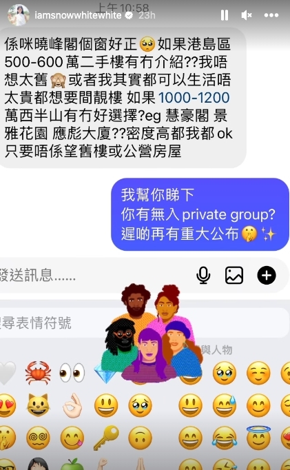 有粉絲DM問有沒有二手樓介紹,直接給雪姨一堆條件,雪姨也照單全收,答應幫他留意,不過最後又提起了秘密的私人群,更指有「重大公布」?!在Story繼續大教如何投資,語氣聽上去超有經驗,十足十投資經紀,莫非手上還有內幕消息?如此大的轉變,難怪有網友忍不住說:「以為佢俾人盜用咗AC(帳號)!」