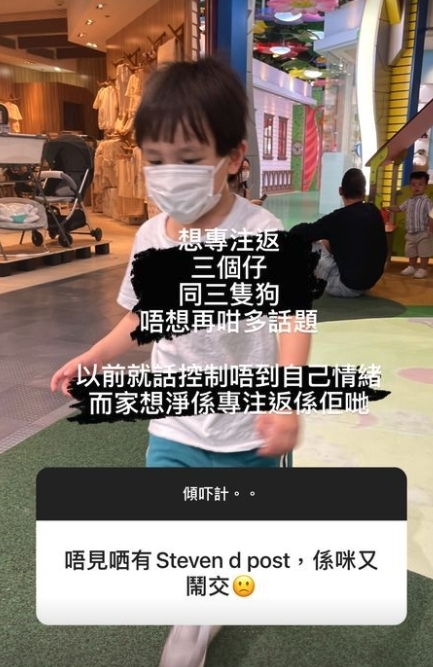 網友問為什麼將所有與Steven有關的照片和Post刪去的時候,雯雯則回答到現在只想關注三個兒子和寵物狗們的生活,不想有太多的話題:「以前就話控制唔到自己情緒,而家想淨係專注返係佢哋(兒子和寵物)」似乎側面否認了與Steven吵架感情生變。