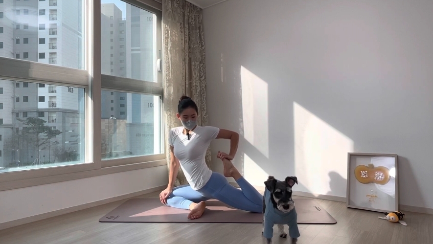 天鵝式動作看上去非常優雅,先將右腳彎曲放在前半身,將左腳向後伸直,大腿向外打開並向地面壓,然後彎曲左膝蓋,抬起左小腿,最後用左手拉住左腳腳趾,這個動作可以改善駝背。