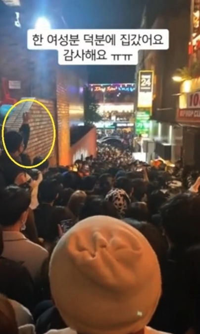 有位網民在社交平台上傳了一段影片,透露自己當晚在人踩人慘劇發生前,曾與其他人被困在小巷,但幸好有位女士揚手大喊後面已經塞死了,沒辦法往上走,又叫前面的人向坡下走,要先讓下坡的人離開,最終令到部分人離開現場,網民指因為這位女士,自己才可以平安回家。