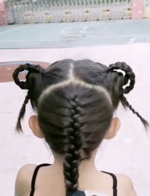 這次媽媽為女兒綁了雙丸子頭,從後面來看還會看到編髮編出一個大大的「X」,還挺有創意的。而老師今天綁的造型有點普通,是不是天天比賽開始感覺到累了呢?