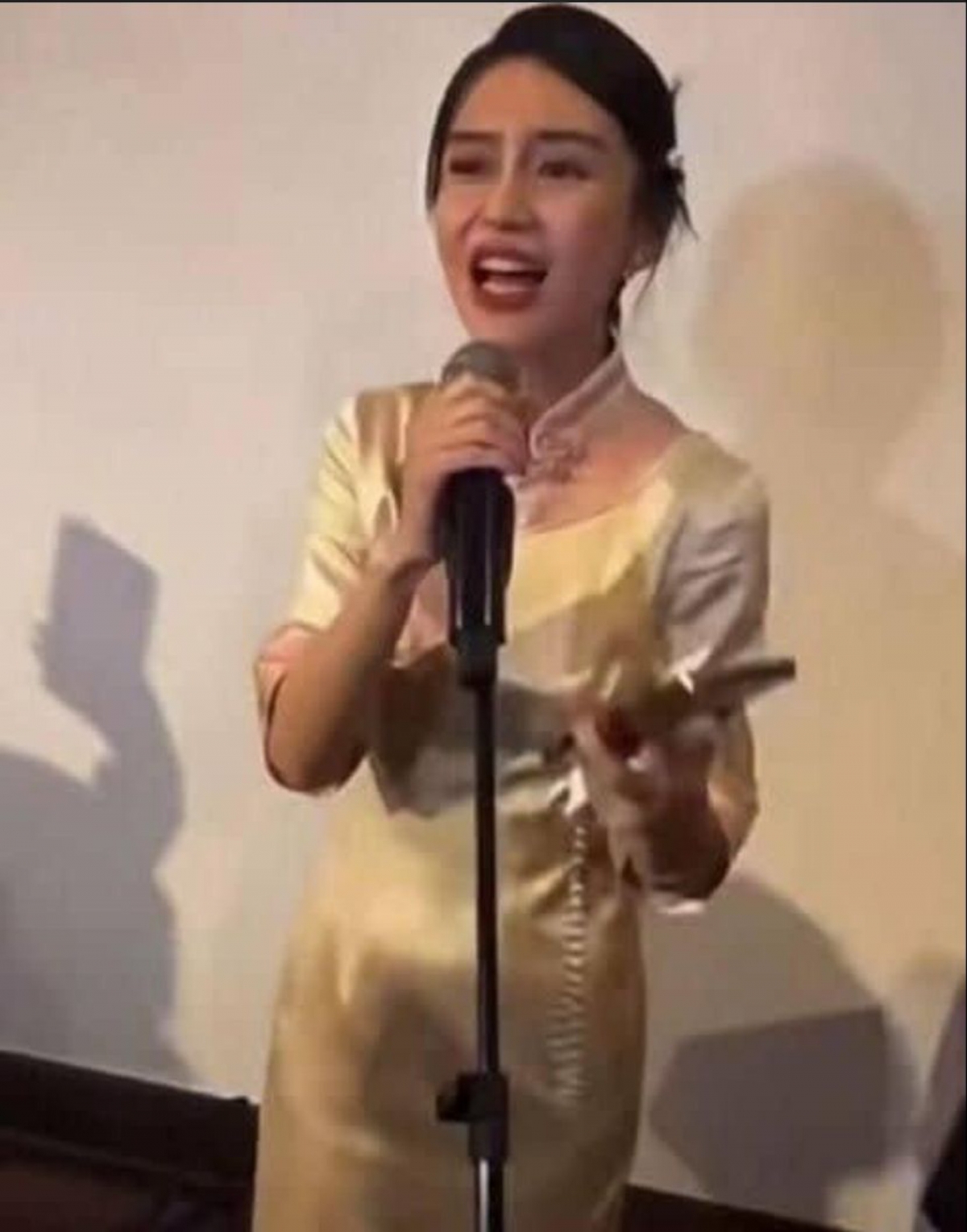 在網上的影片可見,Angelababy疑似與朋友聚會,當日身穿一身淡黃色旗袍,頭髮稍微有點凌亂地盤起,再化上精緻的妝容。而且Angelababy開心地拿著麥克風唱歌,看得出她與朋友一起的時候非常放鬆,又興奮地對著鏡頭揮手兼擺出勝利手勢。
