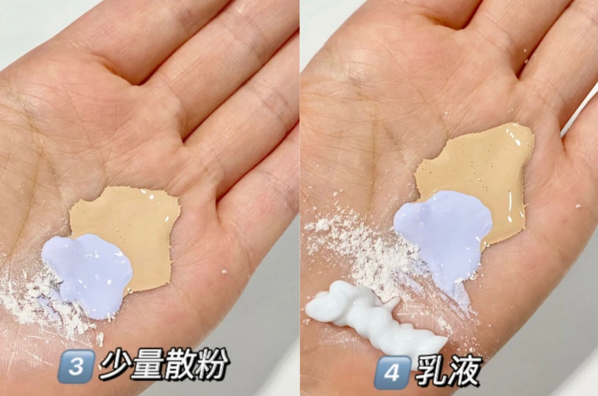 然後再擠出與妝前乳同一份量的乳液、蜜粉,即整體比例是粉底液:2、妝前乳:1、乳液:1、蜜粉:1。其後將四者均勻地混合,需要混合到完全沒有粉末狀為止,之後再使用粉撲拍在全臉即可。