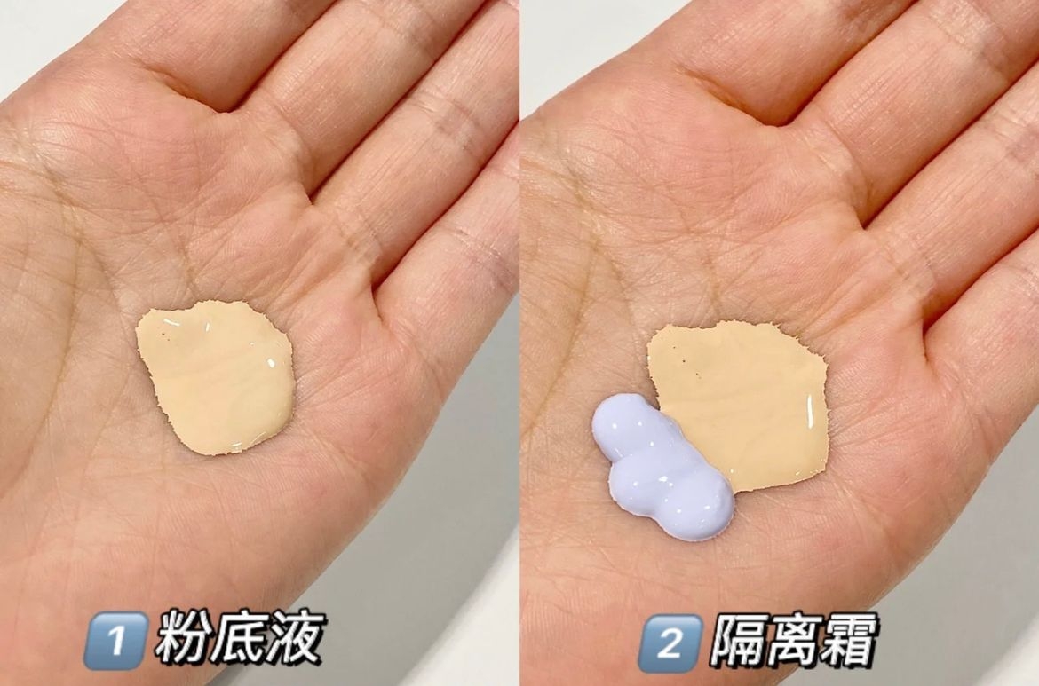 先把妝前乳、粉底液以1:2的比例擠在手上。建議妝前乳可選擇偏紫色調,有助修飾膚色蠟黃、暗沉,令底妝更透亮輕盈。