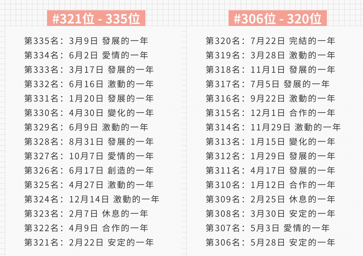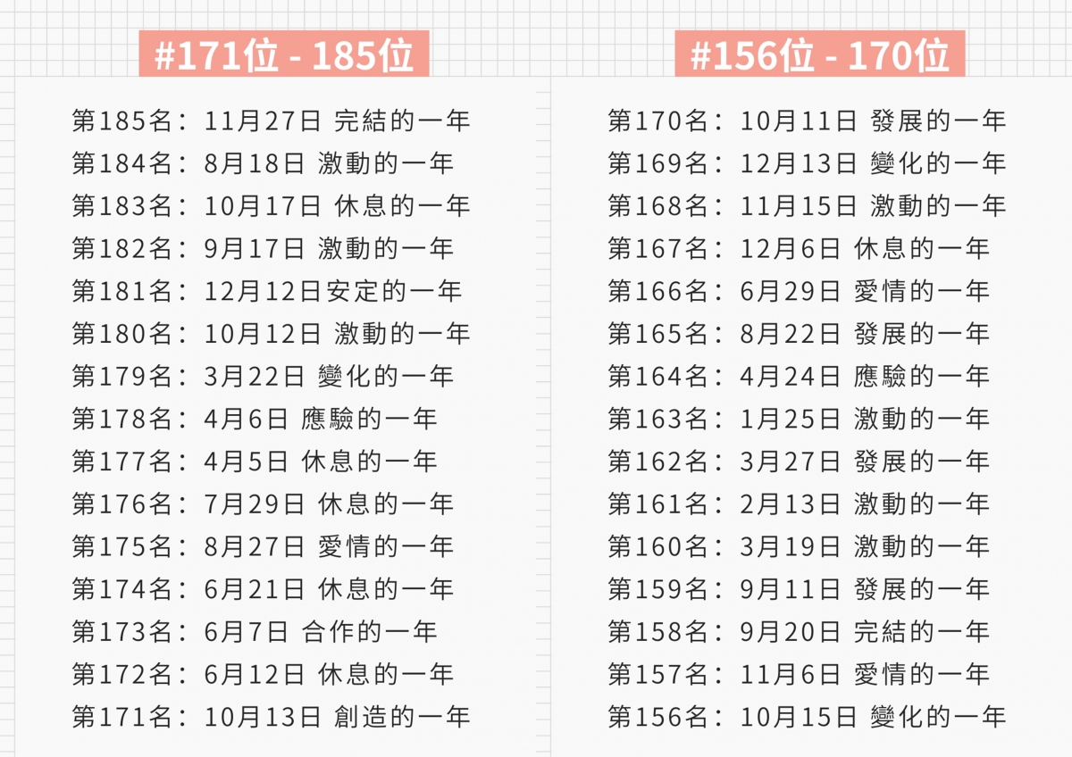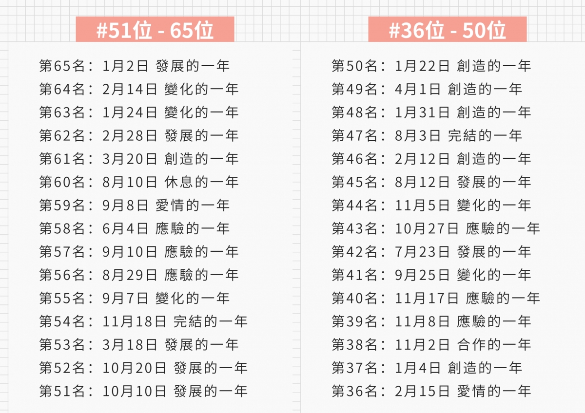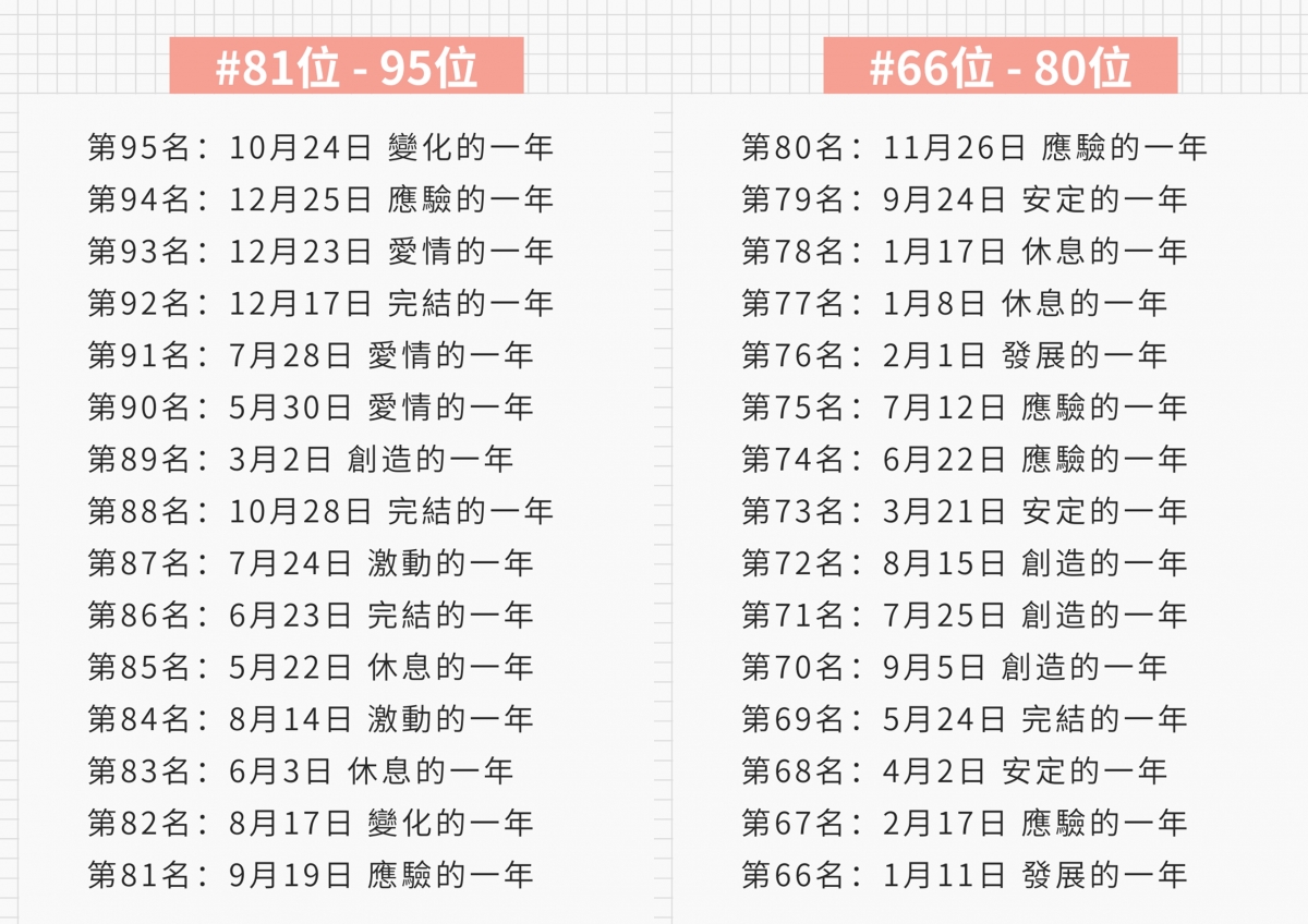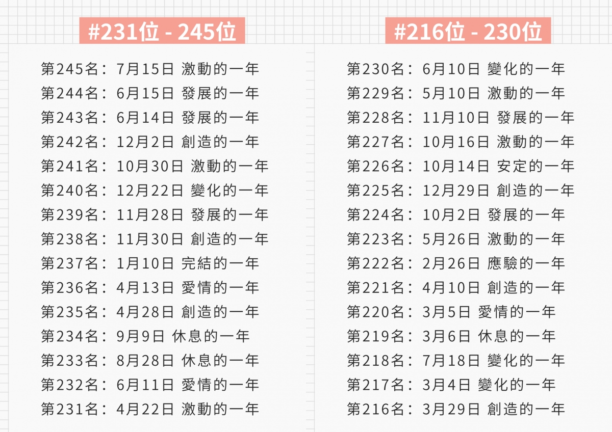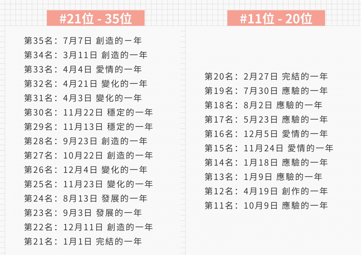 找出你的生日運勢排名後,便來看看它所對應的年度運勢總結解析吧!