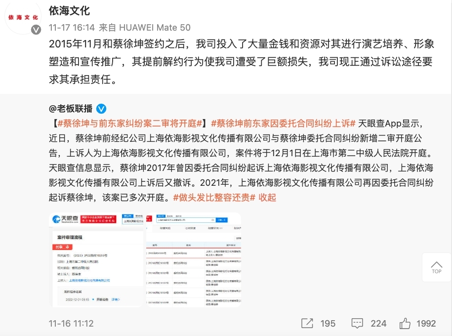 由於依海文化二審上訴與蔡徐坤的合同糾紛,將會於12月1日開庭,故不少網民都認為他們為了上訴成功,不惜公開「培訓合同及費用明細」,故引起大量網民反感。