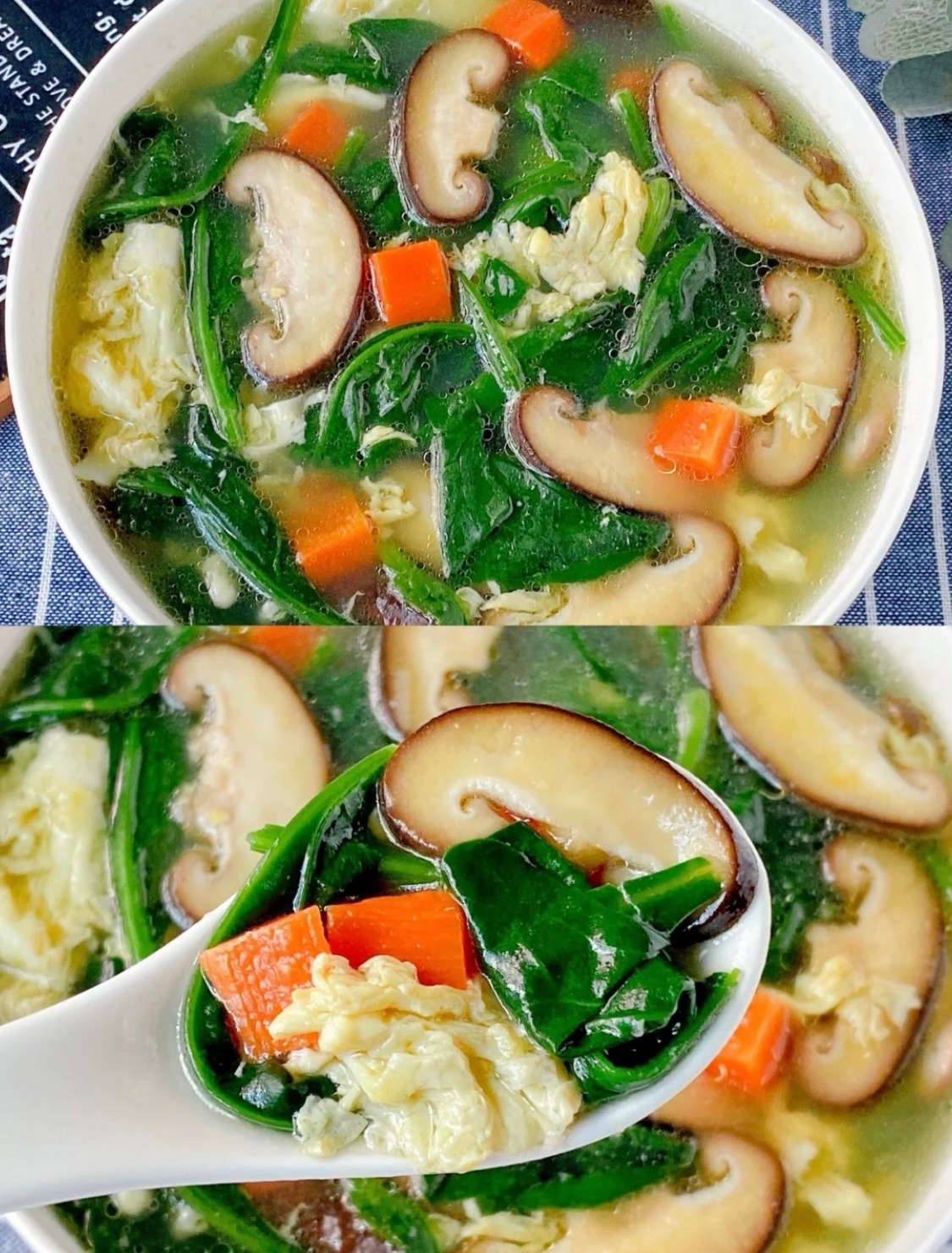 做法:先將紅蘿蔔、香菇、菠菜洗淨並切好備用,之後就下鍋炒香紅蘿蔔及香菇,再倒入2碗水及菠菜煮軟,最後淋上蛋漿。