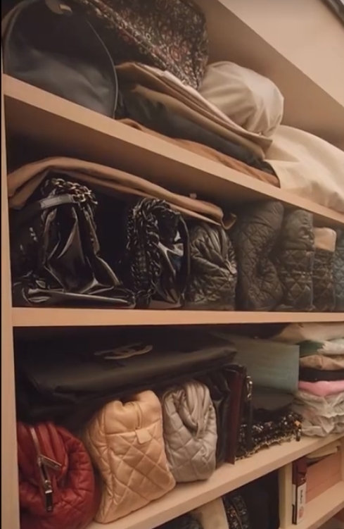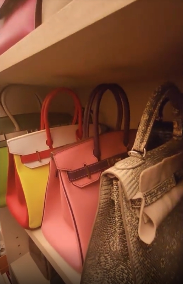 向太在影片中又公開了自己的衣帽間,可見一進入衣帽間就會看到右面有一排櫃,放滿了Hermès手袋,當中有不乏有錢都未必買到的鱷魚皮及限量版款式,這裡的所有手袋估計價值過千萬。難怪連出名的Hermès忠實粉絲的袁詠儀都超驚訝,更叫向太再展示一下手袋給她看!
