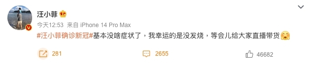 汪小菲在深夜開直播,能看到家中沒有開燈,汪小菲躺著直播不斷翻白眼,病狀貌似非常辛苦。他表示自己的嗓子沙啞有氣無力,不過自己特別想直播,卻發現團隊們全部都確診不舒服「躺下了」。本來以為自己只是患上流感,卻沒想到後來全身肌肉疼痛、頭痛,原來是確診肺炎。後來更自己帶熱度話題,指已經沒有什麼症狀,馬上為大家直播帶貨。這個舉動也被網友嘲笑,指他聲稱不想炒熱度,現在卻親自帶話題帶貨賺錢。