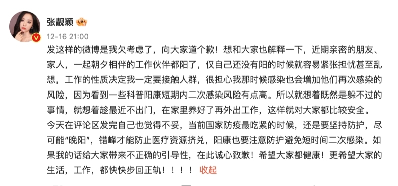 面對大批網民批評,隨後張靚穎在社交平台上發文道歉指自己考慮不周全,還解釋自己作出這次行為的原因是因為身邊很多工作人員都曾染疫,擔心萬一遲一陣子才感染可能會讓他們在短期內二次感疫,這樣風險會更高,所以為了大家的安全,她打算這幾天染疫後在家裡養病,等到康復後才出門。最後,她希望大家要身體健康,堅持防護!