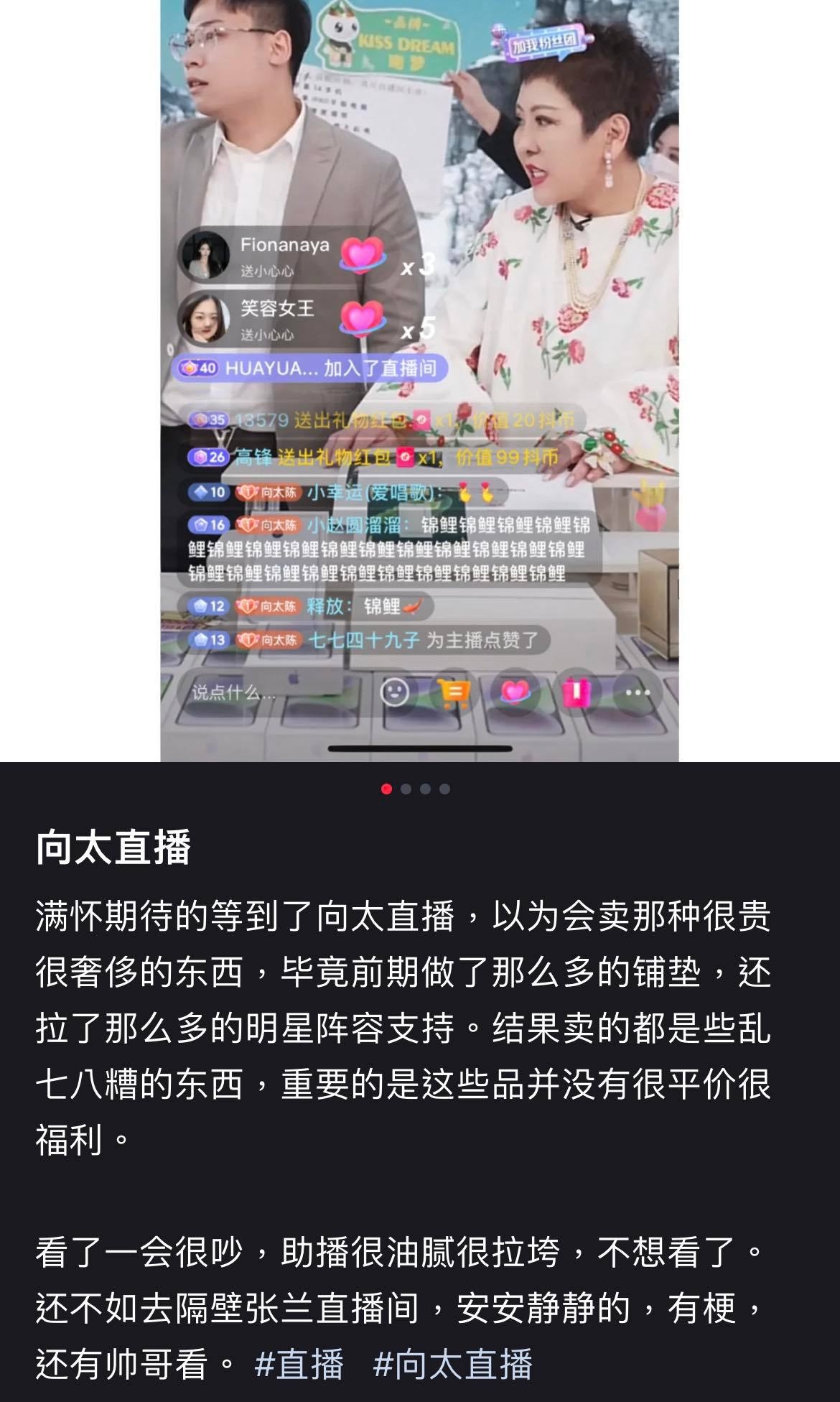但是開播當天也出了不少狀況,不僅在開播半小時後就出現黑屏、網友也投訴向太同網友的互動太少了。而且直播期間貨品轉換太快,導致網友一直無法連上鏈接進入購買網頁。還有不少網友投訴,向太一身貴氣,以為會為網友介紹一些貴一點的產品,但是賣的都是便宜廉價零食同用品。