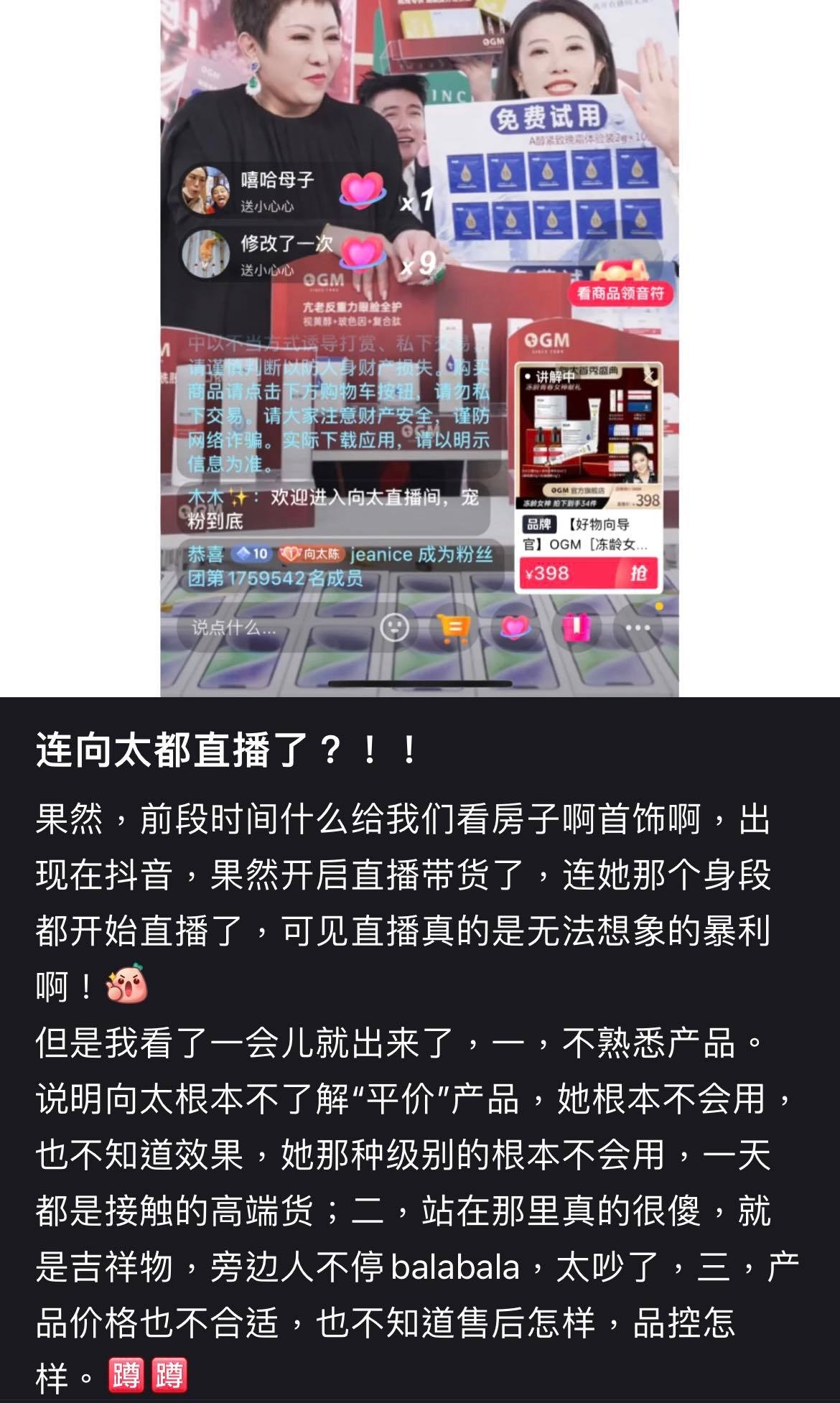 向太進軍直播,大批明星好友撐場!冇做足準備只賣廉價日用品、零食令人失望 網友:她自己才不會用!