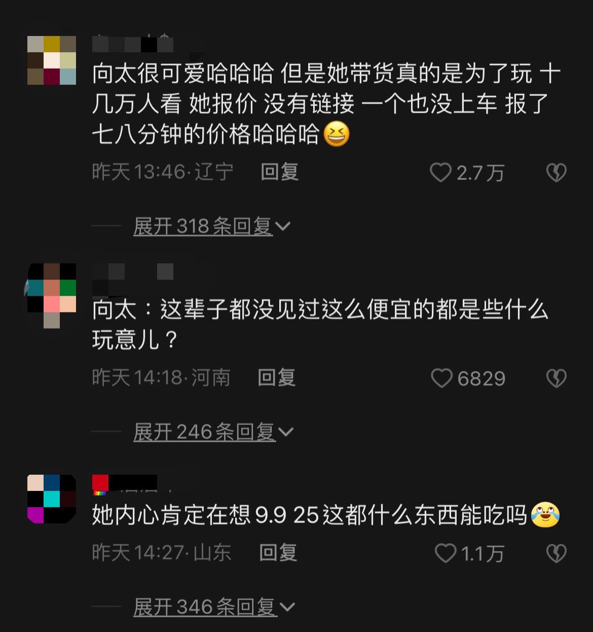 網友還比較直播間價格與原價,相差甚少,說道:「她根本不會用,也不知道效果,她那種級別根本不會用」、「我們是生活,她是來體驗生活」,而且還有一些網友發現,向太在直播時全程都是助播在解釋,而她只是報價同念產品名稱,質疑她沒有在之前做好功課。