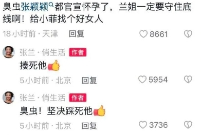有網民將張穎穎疑似懷孕的消息告訴張蘭:「都官宣懷孕了,蘭姐一定要守住底線啊!給小菲找個好女人!」張蘭直接回覆網民:「揍死她」、「臭蟲,堅決踩死她!」似乎仍然不打算接受張穎穎做自己的媳婦,網民笑言:「蘭姐急了」同時也很好奇之後張穎穎的做法。