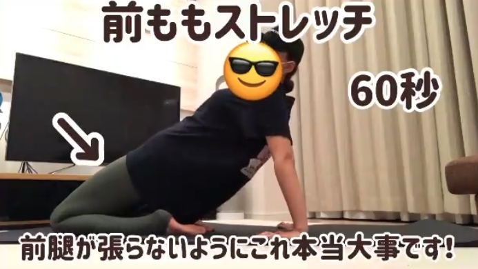 第三個動作先跪在瑜伽墊上,然後雙手放後方支撐著上半身30秒,會確實感受大腿前側肌肉的伸展。