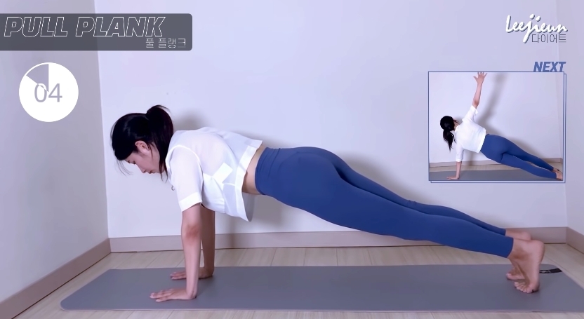 第五個動作是先做出高平板動作,之後下半身左右小幅度扭動,左右手需要輪著摸肩。