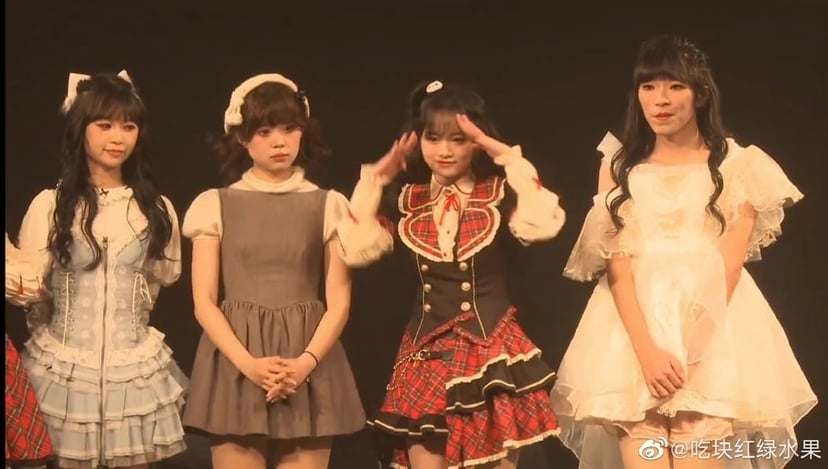 當中最大分別的是站在C位的「妹妹」鈴鐺,一看就發現是一位男生男扮女裝在表演,而且身上的男性特徵超明顯,令到粉絲都難以置信是同一個人。