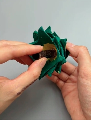 再使用金莎朱古力底杯來包著樹幹,然後在頂部塗上膠水,再黏在樹的底部,讓兩者痴實。