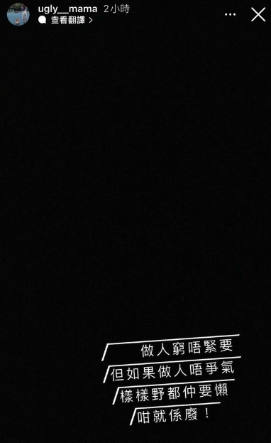 日前雯雯又在IG上PO Story大鬧張致恆,她以黑底白字的背景上寫住:「做人窮唔緊要,但如果做人唔爭氣,樣樣嘢都仲要懶,咁就係廢!」