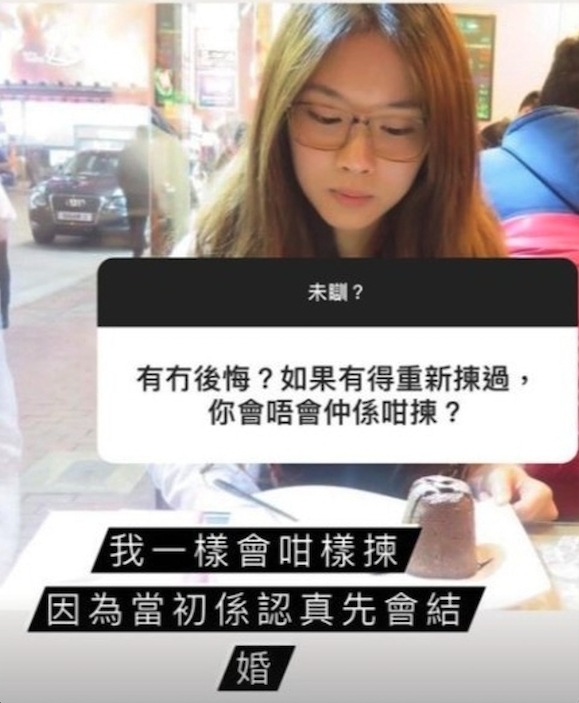 在數天前,雯雯亦曾在IG上與網民大玩「你問我答」,其中有網民問到「有冇後悔?如果有得重新揀過,你會唔會仲係咁揀?」時,雯雯回覆自己並沒有後悔,稱:「我一樣會咁樣揀,因為當初係認真先會結婚。」,可見雯雯當年與張致恒結婚是真心愛對方的。