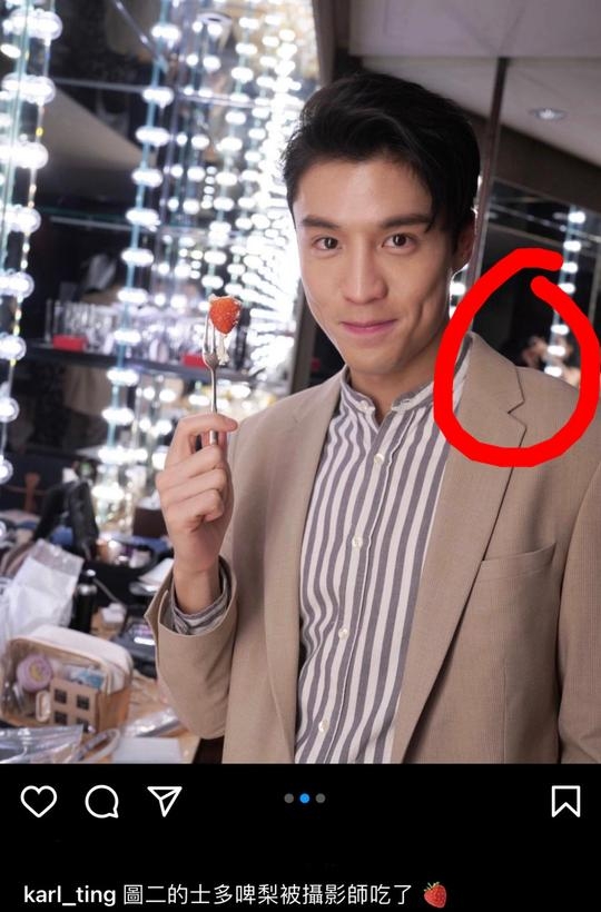 網民先是拿出了丁子朗Po的照片,丁子朗手拿士多啤梨,更在caption中特別提到:「圖二的士多啤梨被攝影師吃了」語氣還帶點可愛。眼利的網民瞬間找到「攝影師」正是郭柏妍,因為丁子朗後面的鏡子正好找到拿著手機拍照的郭柏妍,認為丁子朗特地留下這句Caption相當曖昧!