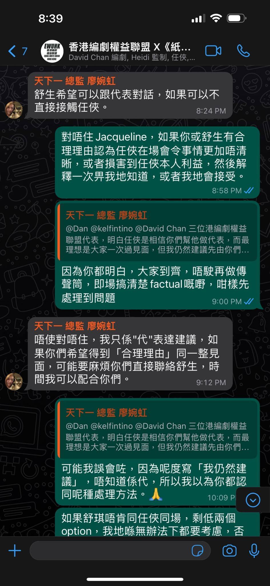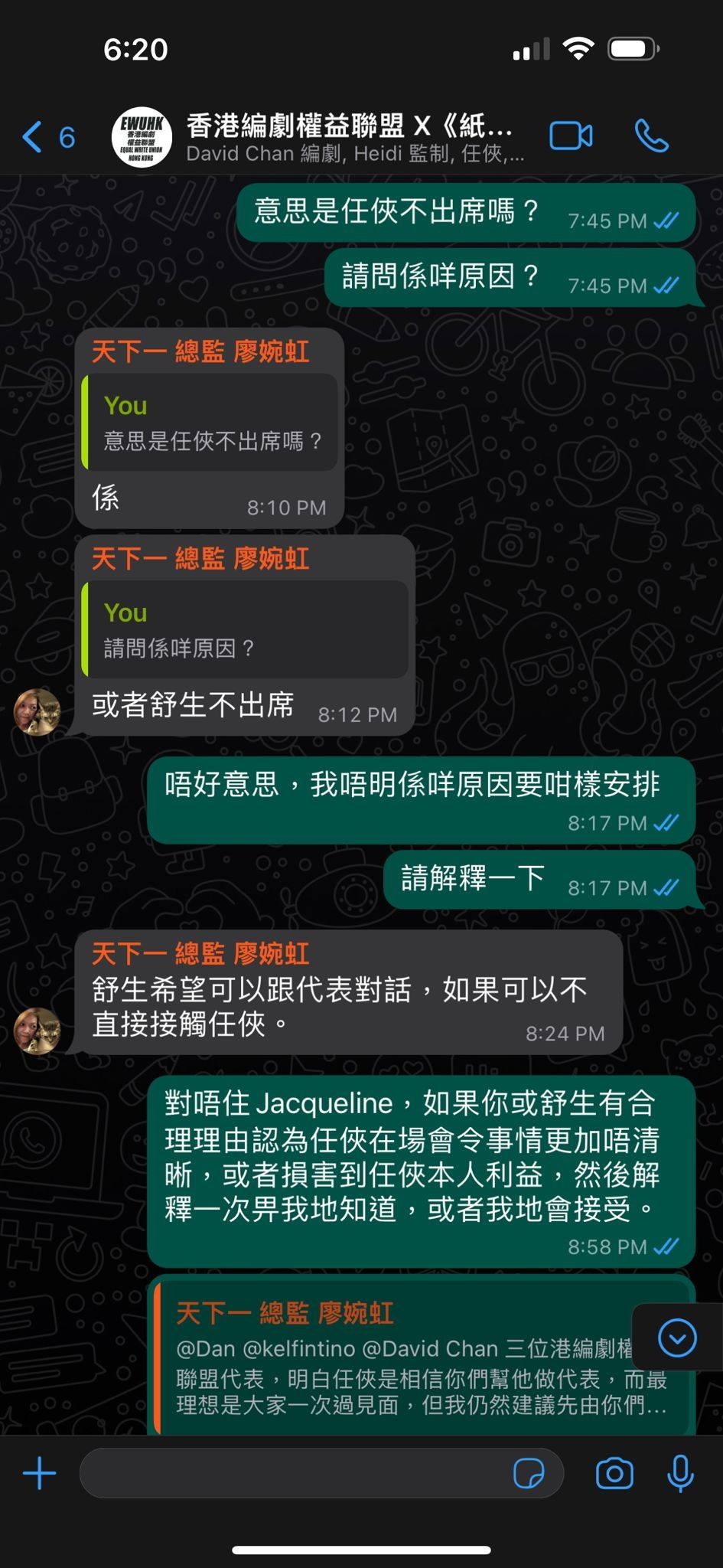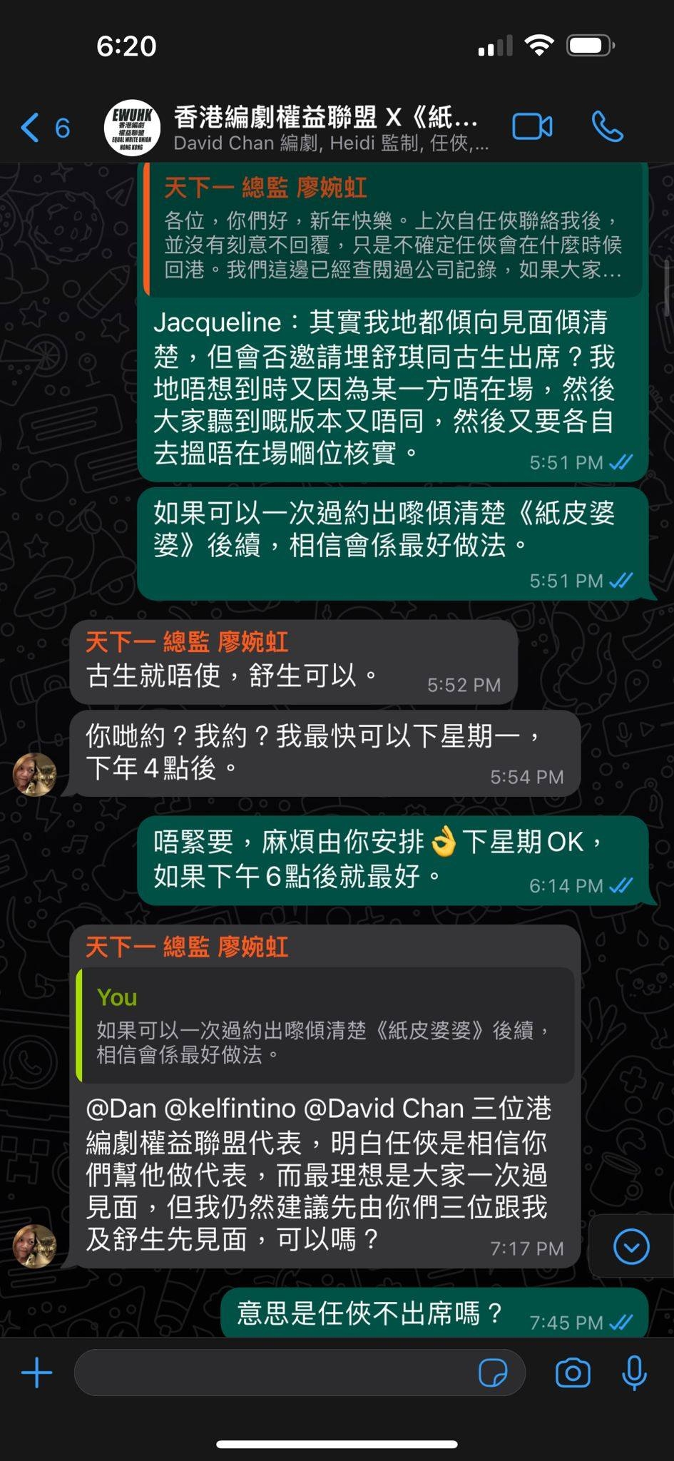 雖然任俠與聯盟要求與古天樂見面,不過「天下一」一直拒絕,指不打算勞動古天樂參與協商,並且要求對方立刻刪除相關的誹謗並且道歉,否則會進行民事訴訟。「香港編劇權益聯盟」Po出雙方溝通的通話紀錄,能看到「天下一」願意約導演舒琪與聯盟的人當面對質,但舒琪拒絕與任俠同場,因此事件還在發酵中。導演舒琪則回應表示《紙皮婆婆》計劃已經被取消,因此自己與計劃已經無關。