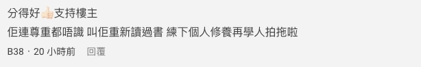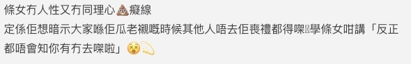 有很多人表示港男應該感激阿公:「係佢送俾你嘅最後一份禮物」認為是冥冥之中,阿公想讓他看到女生的真面目。港男聽到港女的言論後如此驚訝,代表平常女友並沒有展現這樣的一面,幸好趁著這次看清楚:「喪禮某程度係俾在世親人一個安慰...呢個女人一啲都唔換位思考」網友們都斥責女友沒有同理心也不懂尊重,居然說去不去阿公都看不到。大家又覺得呢?