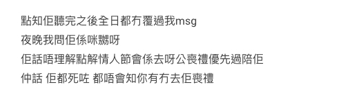 雖然港男精心安排,但是女友依然不滿意,一整天沒有回他的訊息。直到他詢問女友是否生氣的時候,女友居然質問:「佢話唔理解點解情人節會係去呀公喪禮優先過陪佢」甚至說親人已經去世,他去不去對方也不會知道。一番冷血的言論令港男大感驚訝,並且要求分手。