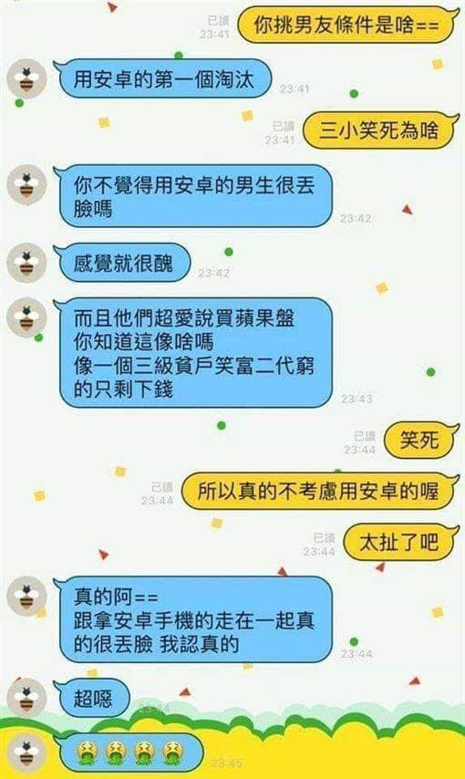 近日有網民在FB Group【爆廢公社二館】中分享了他與一位女生的對話記錄。他先問及對方「你挑選男友的條件是什麼?」,其後該女生竟回覆「用Android手機第一個淘汰」,隨後又稱「你不覺得用Android手機的男生很丟臉嗎?感覺就很醜!」。