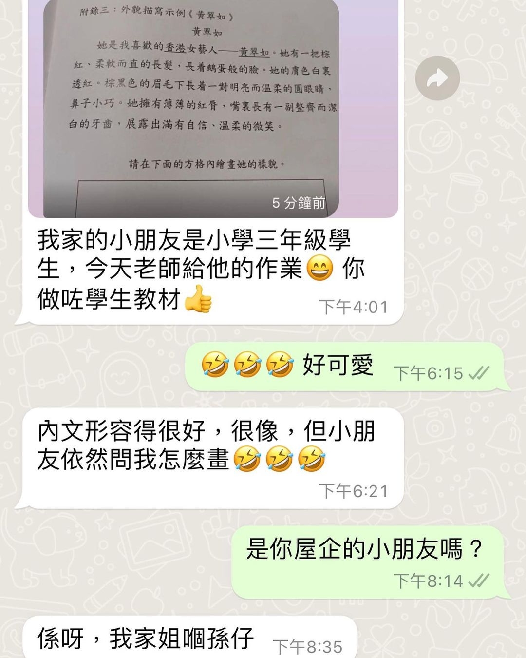 該名親人還表示「內文形容得很像」~該份功課還需要繪畫出黃翠如的樣貌,當小朋友完成畫作後,黃翠如又笑稱「好似呀!靚過真嗰個黃翠如!」,給予小朋友莫大的鼓勵。