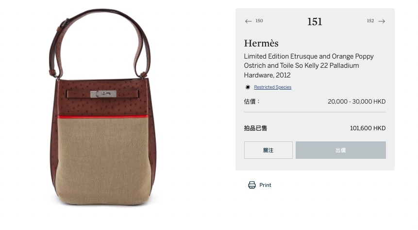 而且在拍賣過程中,限量版的拚色鴕鳥皮So Kelly曾叫價次數最多,手袋本身估價2至3萬,最終以101,600港元售出。
