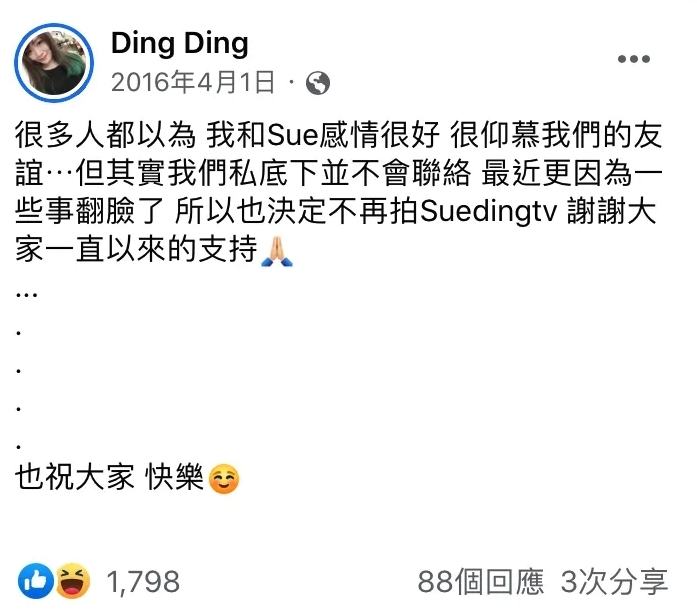 可是大概在2018年左右,突然傳出反面,雖然一直沒有解釋反面原因,但也令很多以前喜歡看她們合作影片的觀眾耿耿於懷。Sue當時更Po文暗示自己被誤解。