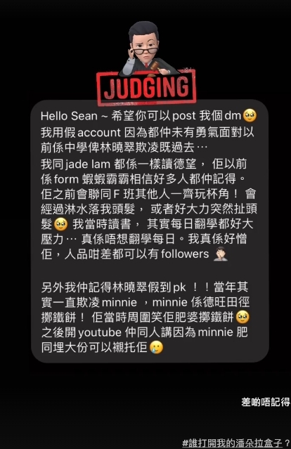 有網友爆料當初與Jade Lam是同學,指Jade一向都會排斥別人,更曾試過倒水在他的頭上等,令網友害怕上學。可是這些爆料都是匿名爆料,因此是否真實還不能確信,不過Sean Lam在Q&A中,對一些不清楚或者假的爆料,都會要求對方多給詳細資料。